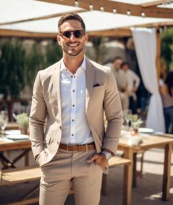 Elegance in summer isn’t about layers—it’s about intention. Choose breathable suits in linen or cotton blends, in soft beige, light grey or off-white tones. Opt for shirts that are tailored but comfortable. Appearance should feel effortless, never forced.